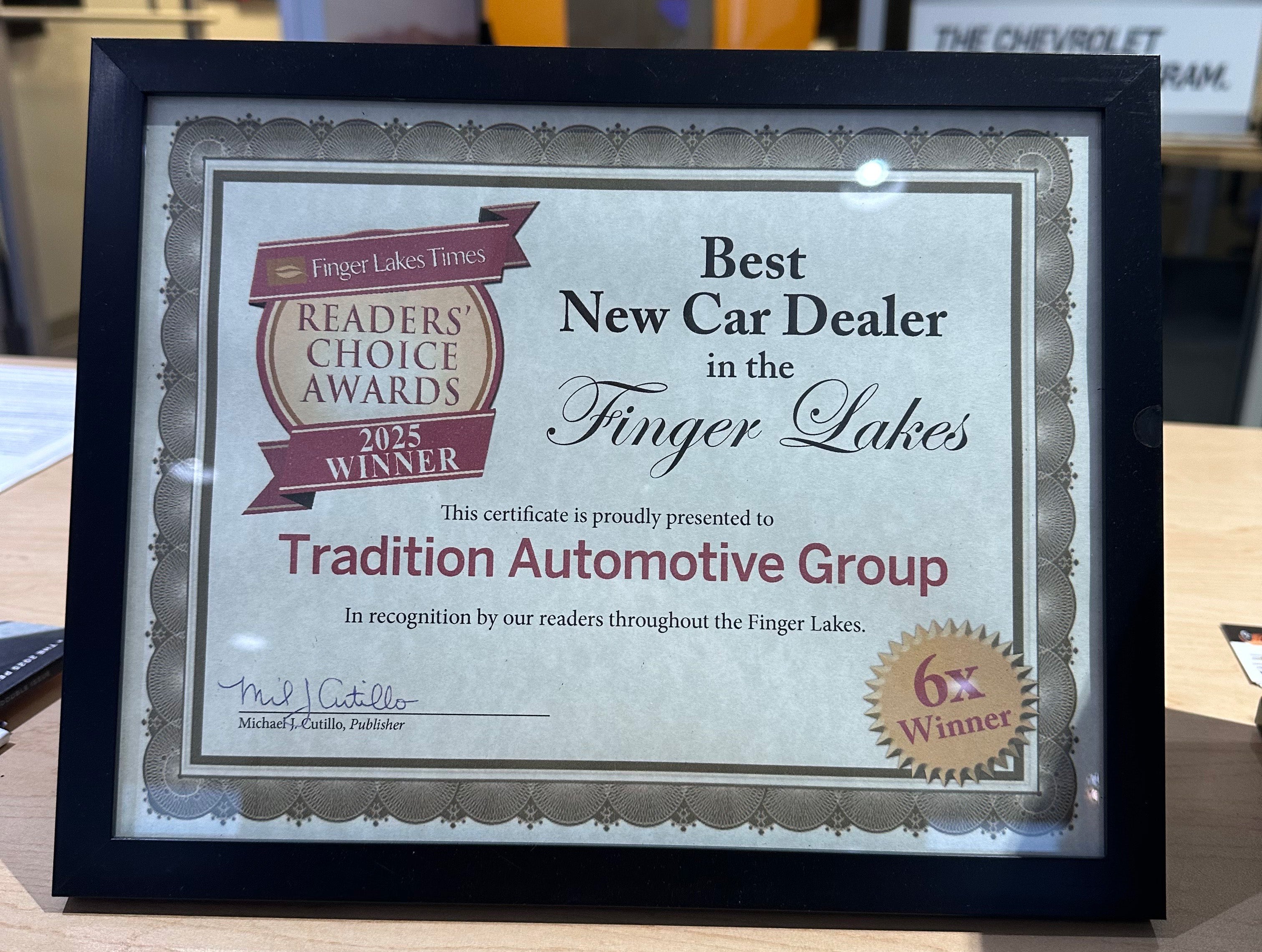 Tradition Automotive Group is proud to have been awarded the Finger Lakes Times Readers' Choice Award for Best New Car Dealer for 2025! This makes our sixth consecutive year of winning this award, all thanks to our community and loyal customers. The Readers’ Choice Award is a reader-driven survey, with both the nominees and the winners being picked by the community. The selected businesses are known in the community to not only provide employees with a great work environment, but also provide customers with excellent service.